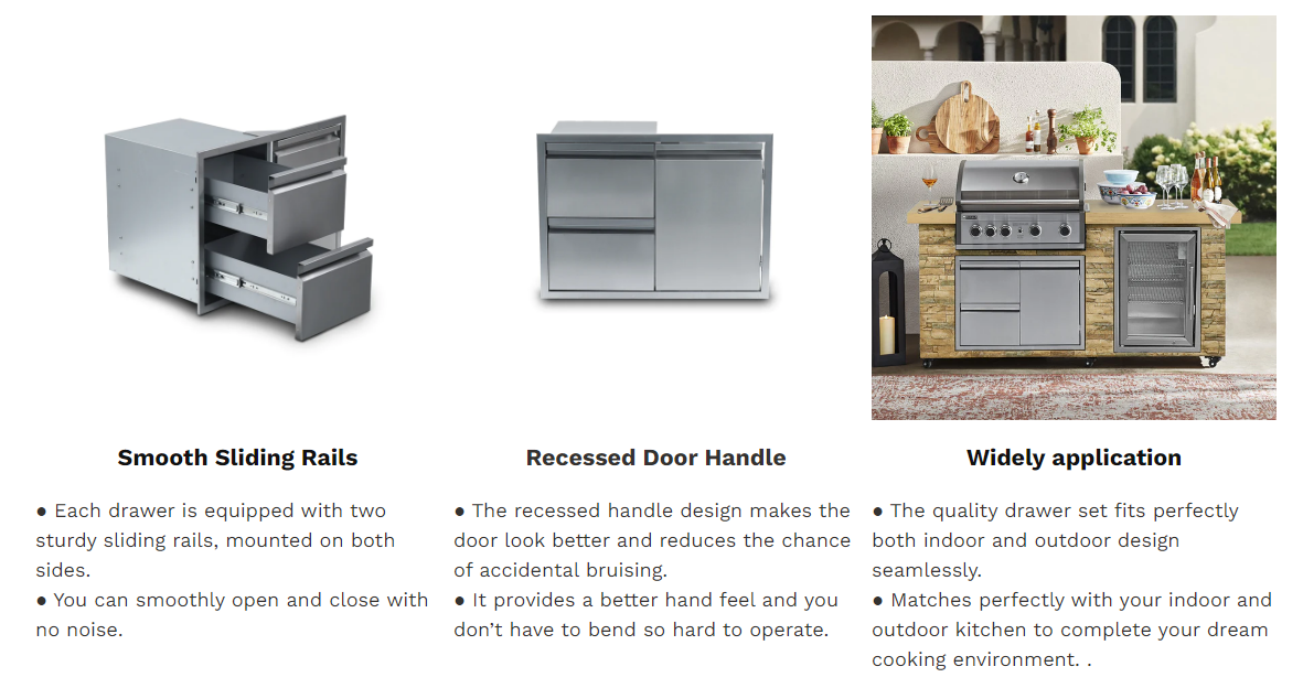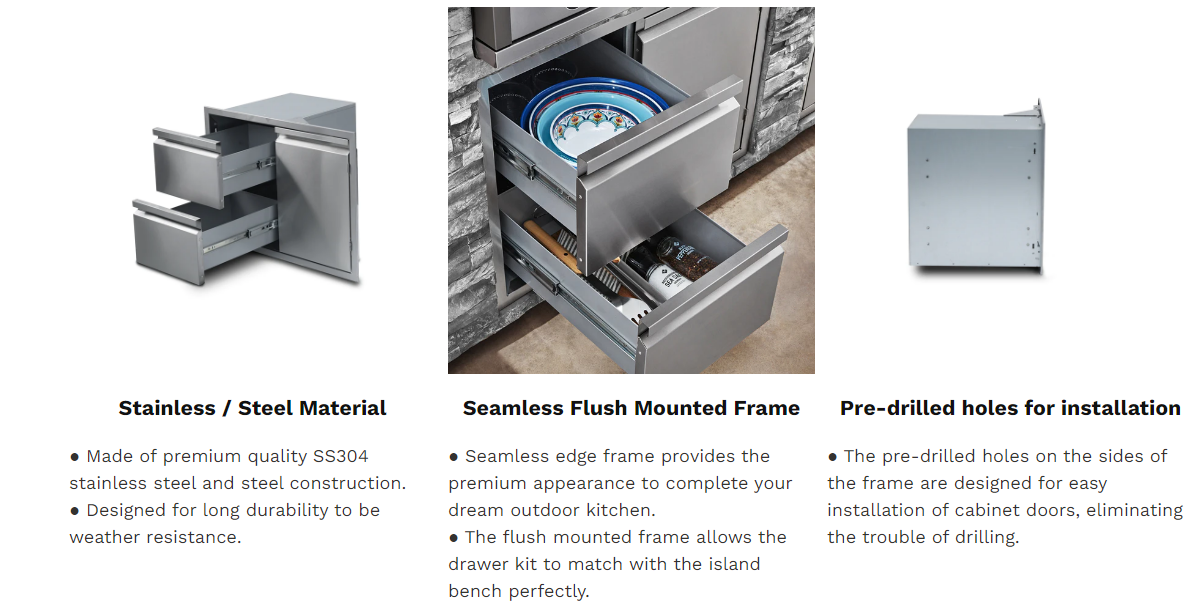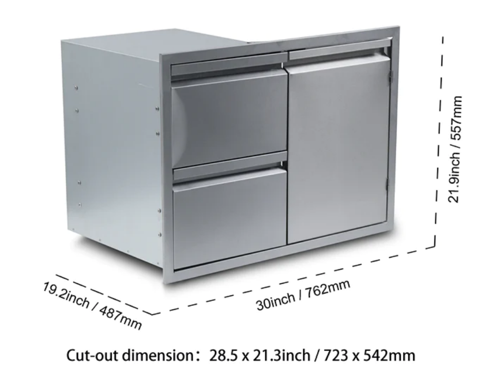 Store grilling accessories and outdoor cooking necessities in this high quality drawer/ door combo system. Built to last, The Prokan Drawers/ door combo System is fully enclosed (drawer section) with durable construction for maximum protection from the elements. This storage solution has been sophisticatedly designed for comfort and ease of use.
