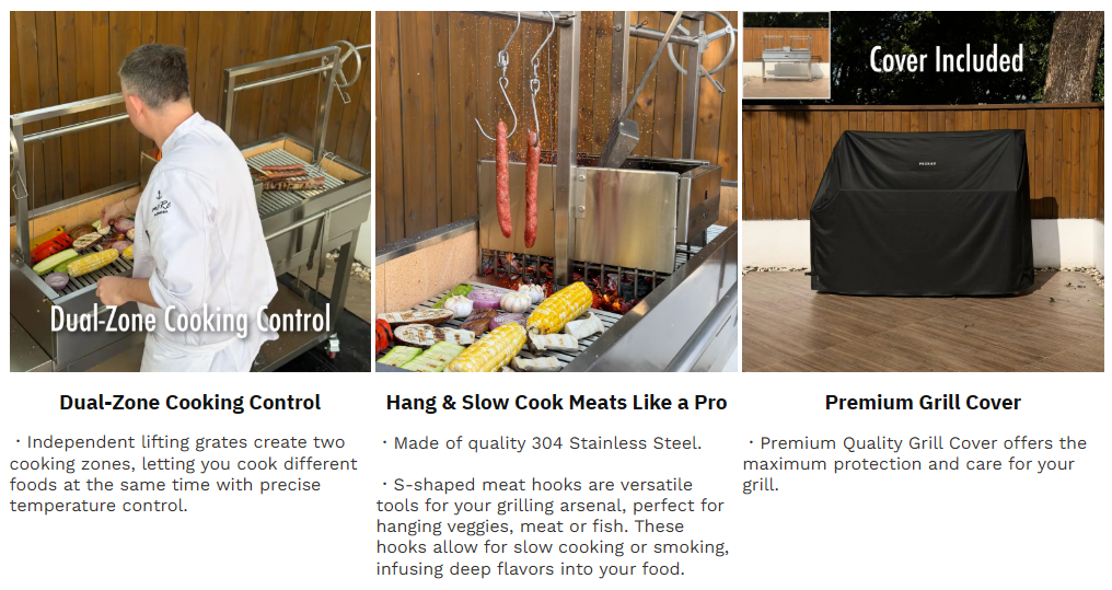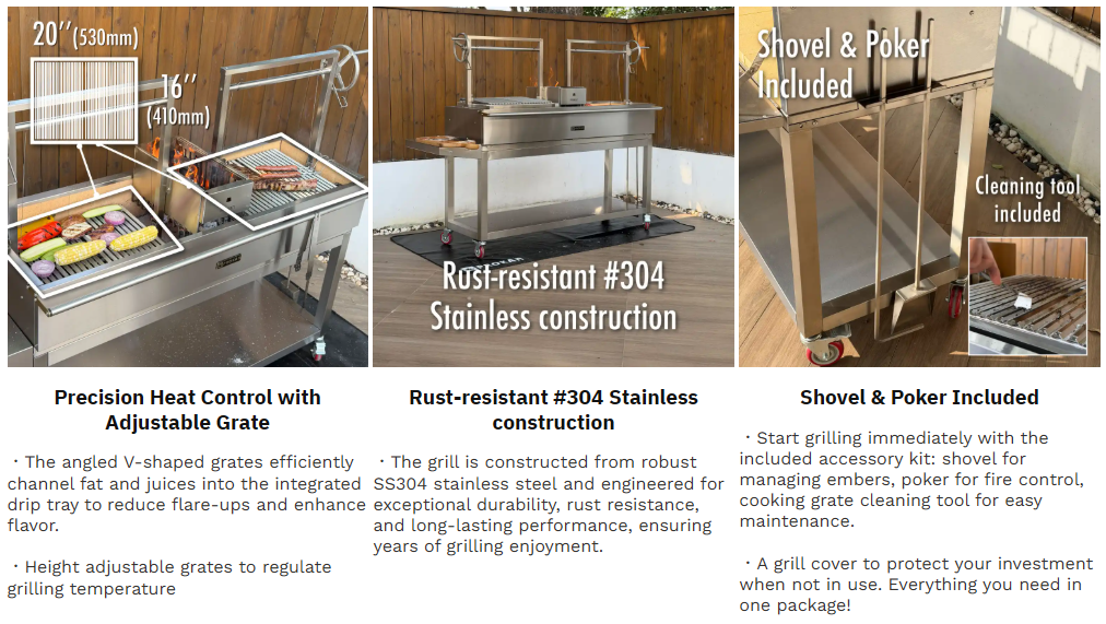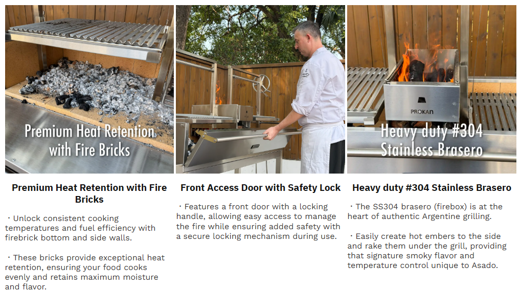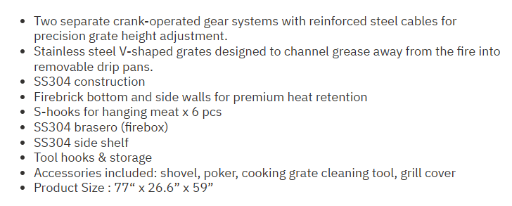 .Two separate crank-operated gear systems with reinforced steel cables for precision grate height adjustment. .Premium #304 stainless steel construction offers exceptional durability and resistance to corrosion. .Firebrick bottom and side walls for premium heat retention .Accessories included: S-hooks, shovel, poker, cooking grid cleaning tool, and cover .SS304 brasero (firebox)