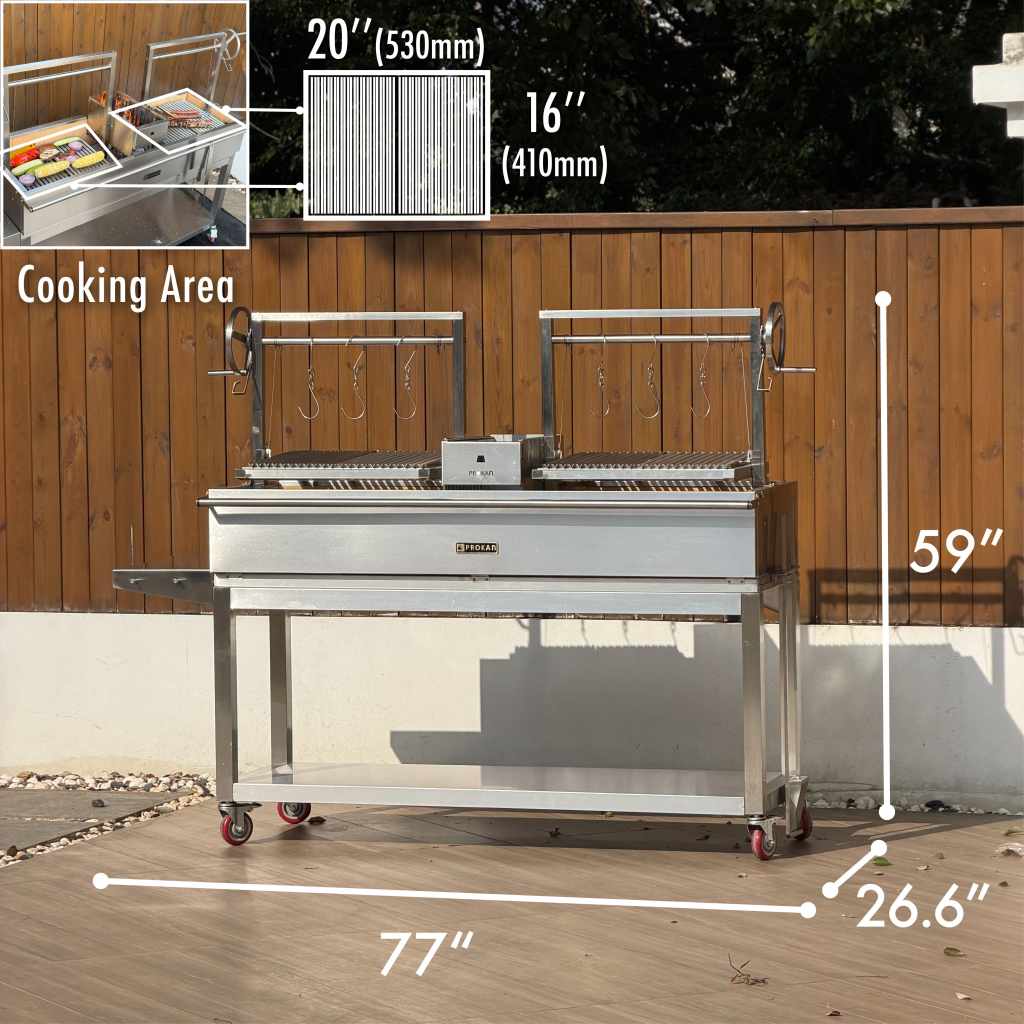 Redefine the art of open-fire cooking with the Prokan 77” Infinity Argentine XL Charcoal and Wood BBQ Grill. Designed for the serious outdoor chef and the high-end residential market, this unit brings the authentic South American Asado experience to the modern backyard. Built with a heavy-duty, full stainless steel chassis, it features a central Brasero (Firebox) that produces a continuous supply of clean embers for a pure wood-fired flavor.